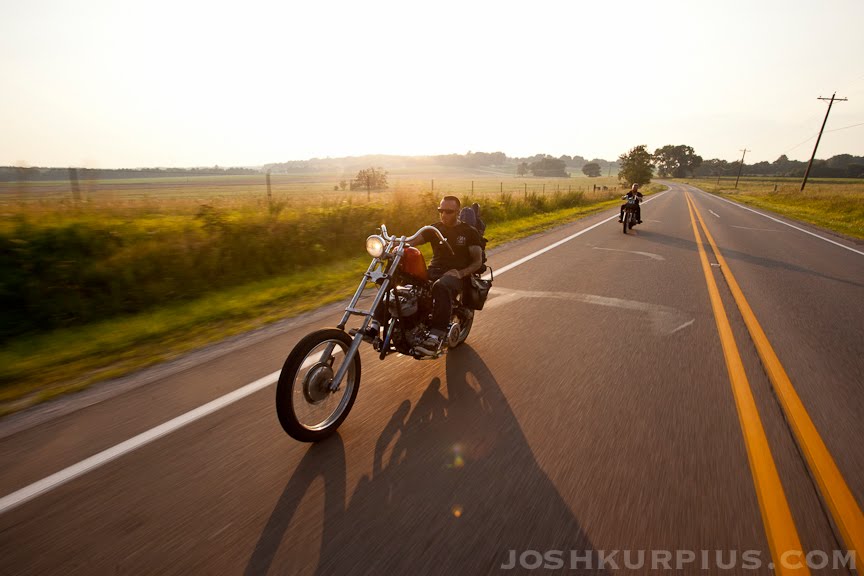 I spent most of the day riding in the back of a truck beneath a blistering sun. A bent valve had me watching the traffic move backwards all the way home from Bloomington Indiana. The big blue sky was calling my name and with everything broken around me I jumped on my Dad's 75 FLH. A nice departure from riding the junk I build to any one of his old bikes. They always seem to work as if they have just rolled off the assembly line. I found myself chasing the horizon line. The setting sun gave way to mortar flashes in every direction. I parked on a gravel rode where a friend was beaten to death with a baseball bat for $200. From here I could see the flashes from 5 surrounding towns. I took in the peacefulness of the freedom and the violence of its cost.